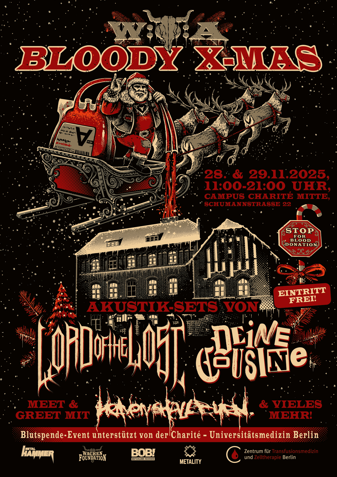 Am 28. und 29. November 2025 verwandelt sich der Berliner Campus Charité Mitte bereits zum zweiten Mal in den Bloody X-Mas Markt. Dort bündeln das Wacken Open Air und die ZTB Blutspende der Charité – Universitätsmedizin Berlin ihre Kräfte, um auf die lebensrettende Bedeutung von Blutspenden aufmerksam zu machen und die Blutbanken zu füllen. Gleichzeitig setzen sie ein Zeichen dafür, dass die Metal-Community mehr ist als laute Musik: Sie steht für Verantwortung und Zusammenhalt.